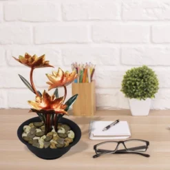 - INDOOR TIERED TABLETOP FOUNTAIN: Features a multi-tier copper-colored lotus flower design and stone-filled base with an interior pump that keeps the water flowing – just plug it in!