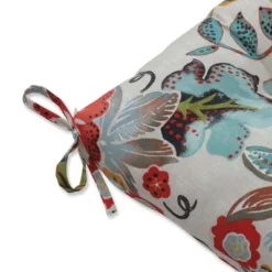 Gorgeous, with shabby chic appeal, the floral watercolor print of this set of two outdoor tufted chair pads is inviting. Flowers in shades of blue, brown, red and gold are set on an off-white linen textured fabric, which is durable and fade resistant. Additional features of these outdoor tufted chair pads include 14″ ties to secure the cushions to your furniture and recycled polyester fiber fill with sewn seam closures. Also suitable for indoor use in kitchen and dining areas.