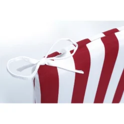 This set of two outdoor seat cushions features a classic cabana stripe. Printed in red and white, the two-inch wide stripes give this pattern a casual feel for any outdoor decor. Additional features of these outdoor seat cushions include rounded corners, 14″ ties and recycled polyester fill with sewn seam closures. Also suitable for indoor use.