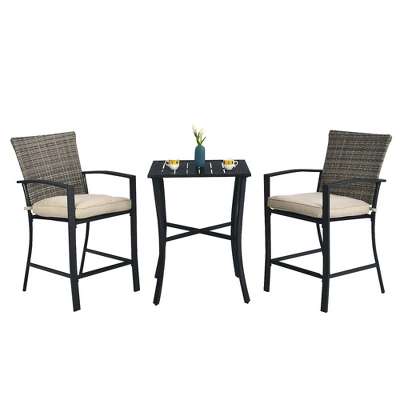- Hassle-free Assembly: This 3 pieces outdoor furniture includes a coffee table and 2 rattan chairs. All complete accessories and detailed instructions are included in the package, so you can quickly complete the installation task. Dimension of Bar Table:27.5”x 27.5”x 36”(L x W x H), Dimension of Chair: 24.5” x 26”x 45”(L x W x H), Weight Capacity of Bar Table:110lbs,Weight Capacity of Chair: 330lbs