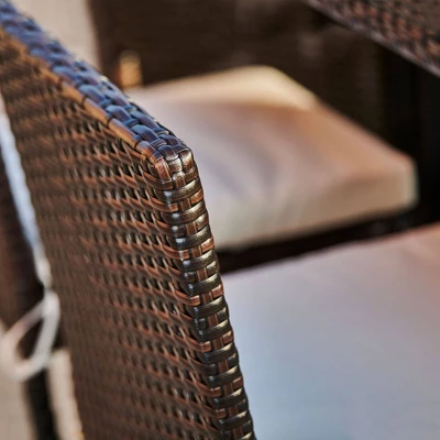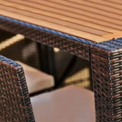 - STYLISH: Dine in style with this rattan and Acacia wood bar set. The quality materials allow four guests to comfortably gather outside for drinks and appetizers.