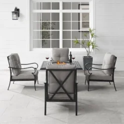 The Dahlia 5pc Conversation Set charms with traditional elements like curved arms and x-back seating. Constructed of powder-coated steel the armchairs offer deep cushioned seats surrounding a propane-powered fire table with a slatted top and solid paneled base. With gas controls and a rack for a propane tank located inside the table’s base, a warm evening by the fire is always close at hand. To complete the look, the armchairs have a resin wicker accent along the base, making the Dahlia conversation set a unique addition to your patio.
