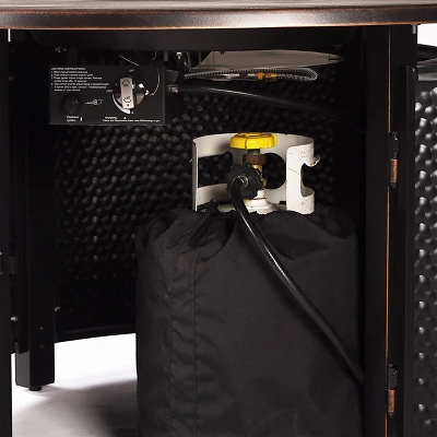 - Comes with a swinging door that easily stores your standard propane tank