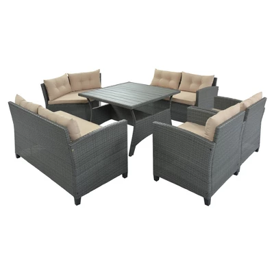 Our fantastic patio wicker sofa set is very suitable for any garden or backyard arrangement and landscaping. There are 2 bench sofas, 1 round corner sofa, 2 armchairs, and 1 dining table. The 40*40 inch large table top made of plywood is broad enough to put food, cards, books, and many others you need. Zippered cushions are filled with thick foam for optimal comfort, and this design is very convenient for people to wash the cushion or pillow cover.