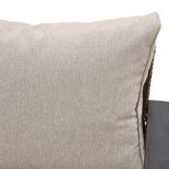 This unique X-shaped armrest collection was designed for stability and aesthetics. The modular design enables the purchase of each individual piece so that you can customize and create your own patio furniture set. This piece is fully covered with Wicker Material on the outside with a Steel Frame material inside. Wide and Thick Cushion provide seating comfortability. Beige color cushions. Weight Capacity is 300 lbs.