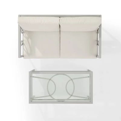 A streamlined silhouette and modern sculptural details are the hallmarks of the Ashford Conversation Set. Constructed from powder-coated steel, both the loveseat and coffee table are as durable as they are stylish. Interlocking circle accents adorn the loveseat, as well as the tabletop beneath the tempered glass. Bring an upscale vibe to your outdoor oasis with the Ashford 2pc Conversation Set.