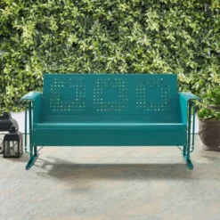 Glide back into lazy summer afternoons with the Bates Sofa Glider. This vintage-style sofa comes in a variety of vibrant colors, offering a fun outdoor lounging experience. The back features a unique basket weave design that allows air to circulate and a smooth gliding mechanism for relaxing in comfort. Made of durable steel, this glider has a powder-coated finish that resists rust and sun fade. The Bates Loveseat Glider is sure to add a dash of retro fun to your porch or patio.