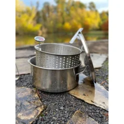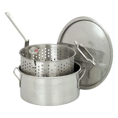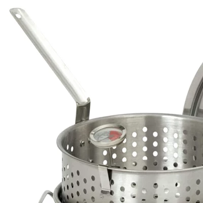 - Comes with perforated basket, lid, and 5-inch, stainless steel thermometer