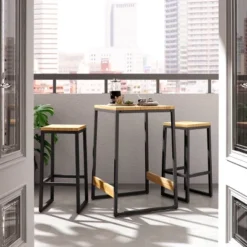 Enjoy dining for two with this chic counter height pub set. The minimalist black metal frame and Acacia hardwood strike a refined balance between materials, which will compliment many other décor styles in your home. This compact set will look fantastic in any kitchen, small dining area, patio, or balcony. The set is easy to assemble and comes with all of the required hardware and instructions.