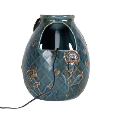 - Style: This indoor fountain is made of hand glazed ceramic and features a distressed blue verdigris quilted floral finish that fits perfectly with your favorite décor.