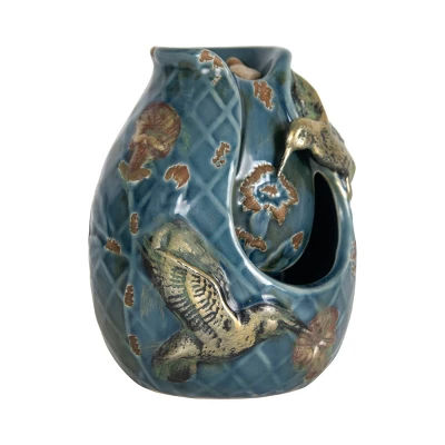 The Foreside Blue Verdigris Hummingbird Fountain brings birds to life as they appear to be hovering as they enjoy nectar from the flowers along the outside of the fountain. With the sounds of a well, water cascades over a handfull of rocks and down into the resivoir. The rich blues contrast nicely with the antiqued flowers and bring this piece to life!