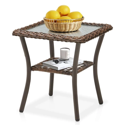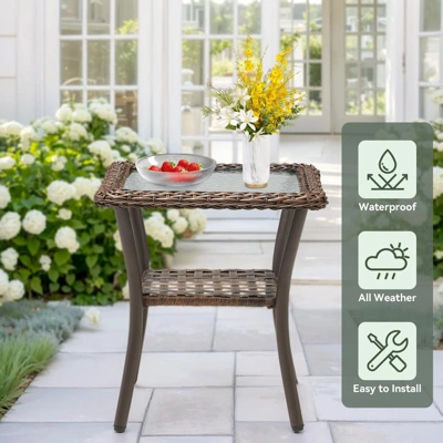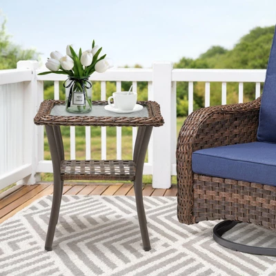 Elevate your space with the Buenhomino Outdoor Side Table. This stylish and durable table features a hand-woven wicker design, a sleek tempered glass top, and a convenient lower storage shelf. Perfect for your patio, balcony, or living room, it combines elegance with practical function for any setting.