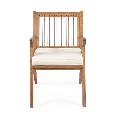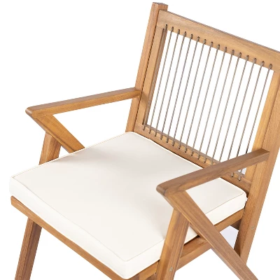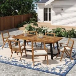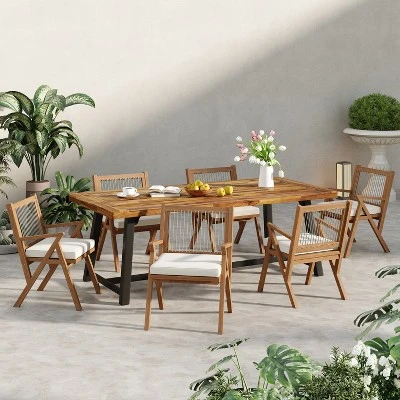Bring contemporary charm and lasting durability to your backyard with this 7-piece outdoor dining set. The solid acacia wood table showcases a slatted surface and sandblast teak finish, while six rope-back chairs offer breathable comfort with cream water-repellent cushions. Built to support up to 400 lbs per chair, this set combines stability, style, and easy maintenance for unforgettable outdoor meals.