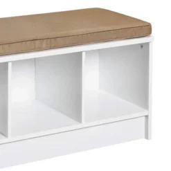 Get style and function wrapped into 1 with this 3-Cube Storage Bench from ClosetMaid.This storage bench provides a soft cushion ideal for sitting while putting on shoes or just taking a minute to rest after a long day. You can remove the cushion and use the top as a shelf for additional storage. With 3 cube storage compartments, this open storage shelf allows you to store shoes, toys, books, and more. Compatible with ClosetMaid Cubeicals Fabric Drawers, this bench with storage offers an additional option for containing smaller items in an organized manner such as media and office supplies (fabric drawers sold separately). Designed with rounded corners, parents can rest easy knowing both they and their kiddos will be safe from harsh edges that can cause injury. The classic white color with tan cushion top coordinates with any decor whether modern, rustic, eclectic, farmhouse, or minimalist.Avoid clutter and get a bit of respite from the day with the ClosetMaid 3-Cubby Cubby Storage Bench.
