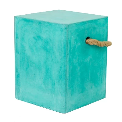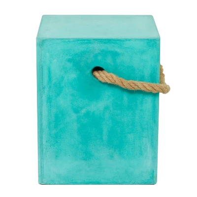 - An outdoor stool featuring an aquamarine square structure furnished with a brown burlap rope that serves as a handle
