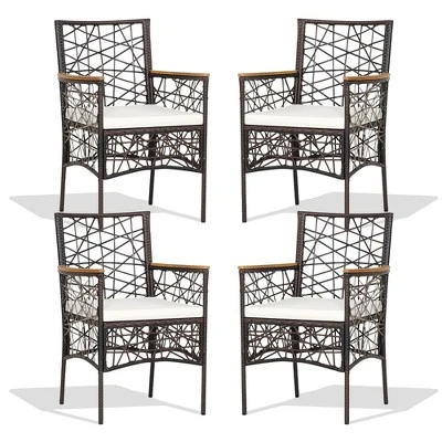 With hollow backrests, acacia wood armrests, soft cushions and wide seats, these patio bistro chairs are ergonomically designed for your upper body. Meanwhile, the all-weather PE rattan and rustproof steel frame make these dining armchairs durable and stable for outdoor use. So you can put them wherever you want, such as patio, backyard, poolside or porch, adding a great addition to your outdoors.