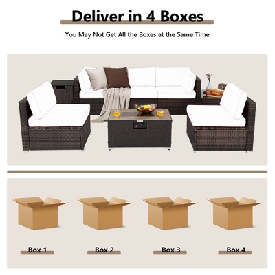- 4-Package Delivery: This 8-piece patio set will be shipped in 4 packages with different arriving times. The screw bag for coffee table and sofas are in box 1 of the sofa set. And the box of fire table also comes with complete hardware. All the 8 pieces are simple to assemble with the clear instructions.