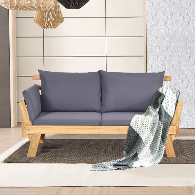 This multifunctional daybed is a perfect addition to your outdoor environment. Made of natural and solid acacia wood, this couch is of high stability and durability. This furniture can transform to a loveseat, a bed or even a lounge chair with the turndown armrests, so you can have different furniture at the same time. Thick sponge padded cushion and pillows can provide great comfort and relax ation for your body. And the cover of pillow is equipped with zipper, which is easy to remove for easy cleaning and maintenance. What’s more, the stylish design and modern appearance will harmoniously match with a variety of styles of other furniture.
