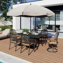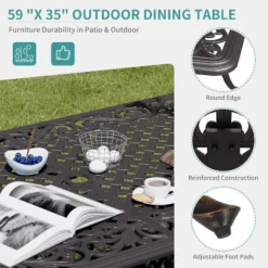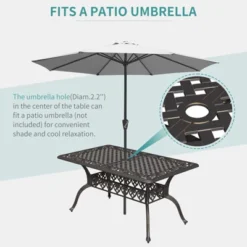 Create the perfect outdoor dining experience with the COZONY Cast Aluminum Dining Table, designed to accommodate family and friends with exceptional durability and style. This spacious patio table features heavy-duty cast aluminum construction with protective coating that resists rust, corrosion, and weather elements for year-round outdoor use. The elegant design includes decorative lattice detailing and gracefully curved legs that add timeless charm to your outdoor space. A center umbrella hole accommodates most standard patio umbrellas, providing shaded comfort during sunny gatherings. Adjustable foot pads ensure stability on various surfaces including patios, decks, and lawns. Perfect for backyard entertaining, garden dinners, or poolside dining, this versatile table combines robust construction with sophisticated design for memorable outdoor meals and gatherings.