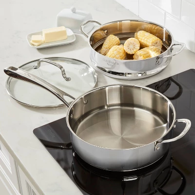 Elegant style meets multitasking practicality in this Cuisinart 3.5qt Steamer Set. This versatile set is made of premium stainless steel and is composed of a 3.5qt sauté pan with steamer insert and tight-fitting lid. The aluminum encapsulated base heats quickly and spreads heat evenly. Conveniently sauté and steam in one, and feel secure while handling your sauté pan with the comfortable Cool Grip™ stick handle. This set is the perfect way to cook healthier, delicious food with useful measurement markings for ease of use. You can prepare nutritious steamed vegetables or sauté flavorful poultry, fish and more. When you finish preparing your dish, you can place all pieces of the set in the dishwasher for easy cleaning.