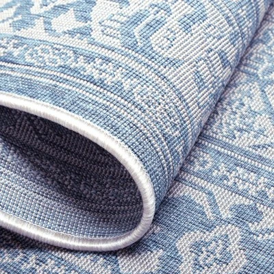 - TRADITIONAL DESIGN: The Nicole Miller Patio Country Dahlia rug collection features a timeless design for three-season spaces in your home, with a beautiful, traditional medallion motif framed by a matching border in blue and gray.