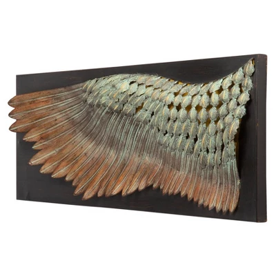 This amazingly intricate sculpt of hand-hammered and polished metal breathes the tale of mythological Icarus, whose wax and feather wings melted, causing him to fall into the sea. Immortalized in this splendid, three-foot-wide gallery-quality wall sculpture, each intricate detail of the arched feathers are captured in a 2½” release that boasts a breathtakingly beautiful verdigris bronze finish. 36½”Wx2½”Dx13½”H. 7 lbs.