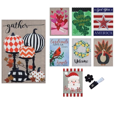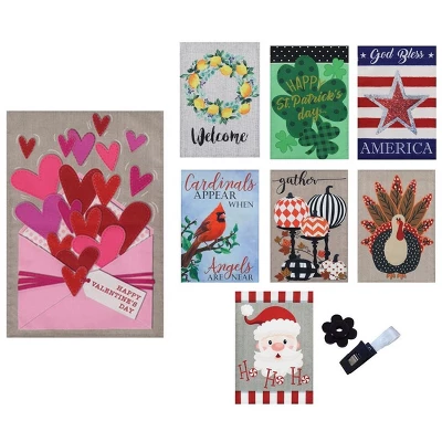 - The perfect set for celebrating all year round! Includes 8 seasonal flags, a flag clip, We have a beautiful Welcome Flag featuring a cheerful wreath made of lemons, which is perfect for spring. Celebrate Valentine’s Day with an envelope overflowing with hearts. 4th of July brings out the red, white and blue on our patriotic flag that has two unique designs on the front and back and reads “God Bless America.” Whether you are celebrating Halloween, Christmas, St. Patrick’s Day, Thanksgiving or a c