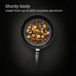 Adamant serving pans are suitable for any stovetop, including induction. Their exclusive CookStar base provides optimal heat absorption, distribution, and retention for even cooking and helps you save energy on any type of stovetop. Made from up to 60% recycled aluminum, the pans are durable and their highly scratch-resistant, nonstick coating makes them safe to use with metal kitchen utensils. The unique coating of silicon carbide particles creates a rugged, hard-as-stone surface with a texture reminiscent of cast iron cookware. You can heat, sear, saute, stir-fry, or pan-fry with ease and dish meals without the worry of ingredients sticking. The ergonomic safety handles with finger shields offer anti-slip, smooth handling, and heat protection. For easy measurements, an integrated laser-engraved scale in liters allows you to measure liquids while cooking. Every cook and kitchen should have one!
