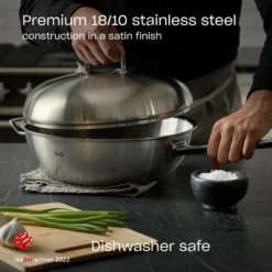 - Updated Stainless Steel Wok: New design with satin finish; designed to conduct heat evenly; great for simmering dishes or stir-frying vegetables; no rivets for easy cleaning