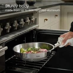 Made from up to 90% recycled 18/10 stainless steel, this frying pan is ideal for searing and frying. Its CookStar base provides optimal heat distribution and lies flat, making the pan energy-efficient and suitable for all stovetops. The frying pan has a large pouring rim for controlled and precise pouring and measurement markings for convenient measuring while cooking. It withstands high temperatures, suitable for oven use up to 450 °F (230 °C), and is extremely durable. The frying pan is just as easy to clean as it is to cook with. The stainless steel rivet-free design makes for easy cleaning and it is dishwasher safe. Whether you use the frying pan to sear, brown, pan fry, or saute, you’ll get restaurant-quality results in your own kitchen. Every chef and kitchen should have one.