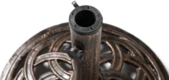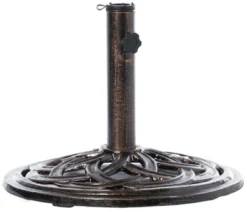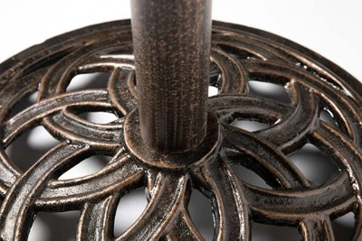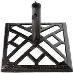 Keep your deck in style with this cast iron umbrella base. This holder will hold your umbrella sturdy in place protecting you from the sun, and rain. Its constructed with a sturdy, all-steel, weather resistant design, adding decor to your patio, balcony, pool, and so on. This umbrella base not only a functional accessory but also a decorative element that enhances the overall ambiance of your outdoor space.