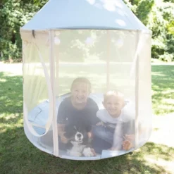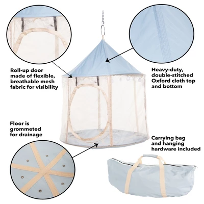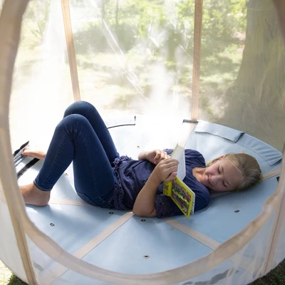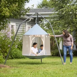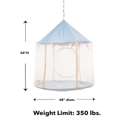 Welcome the Panorama HangOut® to our HugglePod family! Structured with thick vertical webbing combined with a widened hanging point for added stability, this bell-shaped tent/play space is well-balanced and easy to enter and exit. The HangOut top and bottom are stitched from sturdy Oxford cloth in natural shades that compliment nature, with breathable, outdoor-rated flexible mesh fabric sides and roll-up door. Kids (and grownups!) enjoy panoramic views from the inside, and parents can monitor play from the outside. The floor is grommeted for drainage. Outdoor string lights (with water-resistant battery box) add ambience on warm summer evenings; add cushions, toys and books for an especially cozy hideaway. Set includes sturdy, powder-coated Family HangOut Stand (731162). HangOut supports up to 350 lbs.; stand supports up to 500 lbs. Includes hanging hardware and a carrying bag for simple storage and portability; 3 AA batteries required for lights (not included). Adult assembly required. HangOut and Stand are not intended for use as a swing.