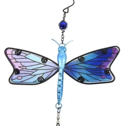 Pretty Wind Twirler With A Dragonfly At The Top Made Glass Which Is Painted To Give A Stain-Glass Look. The Twirler Attached Underneath Is A Metal Circular Strip Painted In Colors Of Red, Gold And Purple.. New.. Measurements 31.0 In H X 8.75 In W X 4.0 In D. . No Assembly Required. Imported