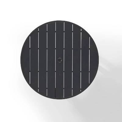 Gather around the Kaplan Round Dining Table for a cozy meal al fresco. The round table features a slatted design that elevates the sturdy steel construction. A standard umbrella hole allows you to add some shade on a hot summer day. Simple and stunning, the Kaplan dining table will be a welcome addition to your outdoor entertaining.
