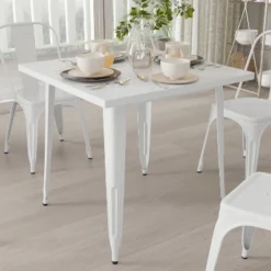 Minimalism shines in this modern dining table crafted with a stabilizing brace underneath to add stability and maximize leg room. The square top comfortably accommodates up to 4 adults. A powder coated finish offers an array of colors you can pair with our metal dining stools in multiple different styles and colors to get a seating arrangement custom designed by you. Integrated glides protect your flooring when used indoors. Additional Features: Integrated Rubber Floor Glides, Item Size: 31.5″W x 31.5″D x 29.5″H