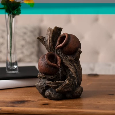 - Contemporary style indoor fountain with water that flows down the two clay pots that are entwined with the tree trunk