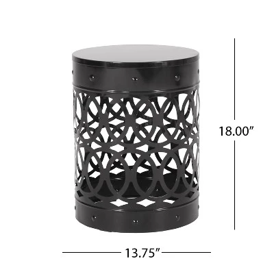 This side table highlights modern minimalist lines and iron hollow design, with a cylindrical structure and overlapping circular cutting patterns. The powder-coated process enhances durability.
