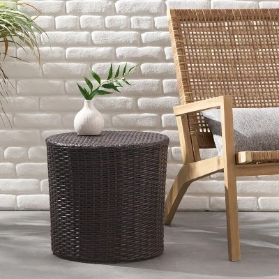 This wicker outdoor side table offers a stylish, compact design to save space, with a durable wicker-aluminum structure resistant to outdoor conditions. Perfect for holding drinks or decor, it requires no assembly for hassle-free use.