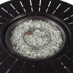 Whether your outdoor retreat is located in the mountains, on the coast, or somewhere in between, this fire table set will extend your evenings with friends and family around the fire. With this addition you can enhance your outdoor setting with even more ambiance and relaxation. This fire table set comes with an Outdoor Aluminum 44 in. Round Fire Table Set with Four Deep Seating Swivel Rocking Chairs, Fire Beads, Lid, Propane Tank Cover and Table Fabric Cover. The dimensions for the fire table are: 44″ L x 44″ W x 24.5″ H, 71.5 lbs. Each chair dimensions are: 28.3″ L x 33.8″ W x 34.2″ H, 27.3 lbs. The chair seat is 12.6″ H from the seat to the floor.