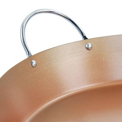 Create unique dishes with the Carbon Steel Nonstick 16 Inch Paella Pan in Copper. It’s shaped to be wide and shallow for maximum heating surface. The nonstick copper surface allows for crispy rice on the bottom while providing easy food release. The pan’s matte black carbon steel exterior can withstand strong temperatures and even heating. For long lasting use and quality, hand wash the pan. Create the best paella dish, cook up some classic eggs and bacon, or sear fish to perfection for large groups.