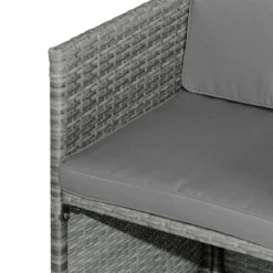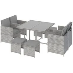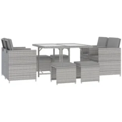 This nine-piece outdoor rattan dining set brings the comforts of your kitchen outside. Everything is all in the same place: four chairs, two easy-store ottomans, and a glass dinner table. Enjoy perks like tilted backrests and thickly padded cushions in the great outdoors. This set is perfect for pool parties, picnics, and barbeques. Made of water-resistant polyethylene plastic with a load-bearing powder-coated steel frame, this set was made with outdoor in mind. Get inside out with Outsunny.