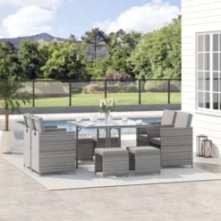 - Nine-Piece Rattan Patio Dining Set: This nine-piece PE plastic rattan dining set has four armchairs, four easy-store ottoman footrests, and a tempered glass center dinner table. Serve guests and seat up to four in the great outdoors. Bring the comforts of your kitchen and create a lovely area to lounge outside on your patio, by the pool, or gathered around the garden.