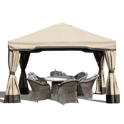 Introducing our Patio Gazebo Aluminum Canopy. Made with high-quality polyester fabric, it offers fade resistance, durability, UV protection, and water resistance. The spacious size is perfect for hosting parties and gatherings. The solid all-aluminum frame provides sturdy support, while the included netting and curtain offer privacy and protection. Easy to install with all necessary hardware included. Enjoy your outdoor space with our reliable and stylish gazebo.