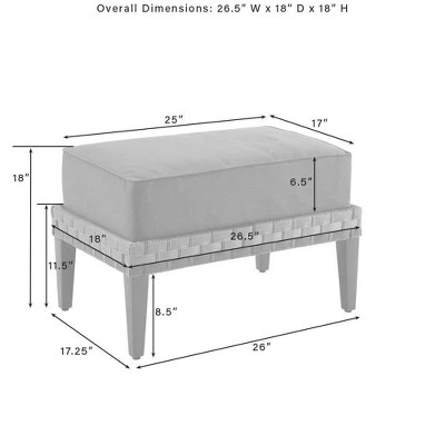Kick up your feet and catch some sun with the Prescott Ottoman. Wrapped in all-weather wicker, this ottoman is resistant to the whims of mother nature. The wide wicker is beautifully weathered and has the textured feel of natural fiber. With its thick, moisture-resistant cushion, the Prescott Ottoman can double as extra seating for your outdoor retreat.