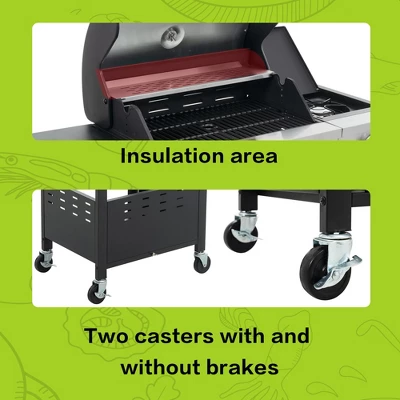 Electronic pulse ignition, fast and convenient.Adopting an advanced electronic pulse ignition system, it ignites with just one click, saying goodbye to the cumbersome manual ignition method and making outdoor barbecues more relaxed and efficient.Independent fire control, precise cooking.The stove surface is equipped with multiple sets of burners, allowing you to adjust the heat according to the needs of the ingredients, easily achieving precise cooking of different ingredients. Whether it’s a large steak or vegetables, they can all be cooked to their liking.Stainless steel material and black lacquered cabinet body, with a grand and durable appearance.The upper cover and panel are made of stainless steel, which is easy to clean, corrosion-resistant and has a high-end texture. The main cabinet is painted black, combined with a simple line design, presenting a fashionable and grand overall appearance.Built-in thermometer, allowing you to control the heat at any time.The top of the oven lid is equipped with a thermometer, which can monitor the internal temperature of the oven in real time, ensuring that the baking process is more controllable and avoiding baking failure due to improper heat control.