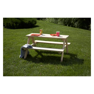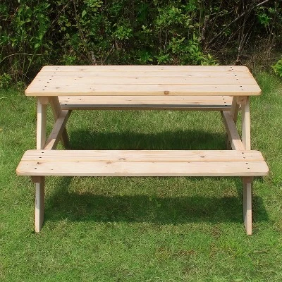 This classic Kids Picnic table is made out of Fir wood. It is ready to be painted or stained, as it is unfinished. The rounded edges and corners are children safe. Suitable for indoor and outdoor use and seats up to 4 kids. Minimal assembly required; hardware and instructions included.