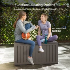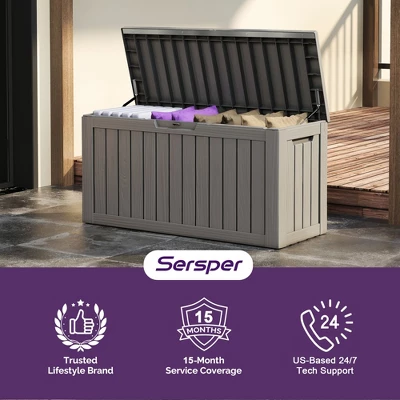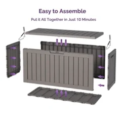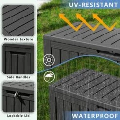 This versatile storage box can also double as a side table, patio seat, or storage ottoman, adding both functionality and style to your outdoor space.It features easy assembly with no screws or tools required for quick and hassle-free setup. The durable construction ensures it is waterproof, UV-resistant, and resistant to peeling, rust, and warping. Both sides are equipped with sturdy grooved handles, making it convenient to move the box when needed.