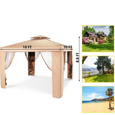 The straight-leg frame provides 100 sq. ft. of shade, and you are sure to stay relaxed and comfortable with the tent’s convenient top air vent. In addition, this gazebo features special netting that can be closed to convert your tent into a more private space. The canopy is made from water-resistant and flame-resistant 150D Oxford fabric with UPF 50 plus UV protection. A carrying case is included with your SUGIFT canopy for easy transport.FeaturesVented Double Roof:Give you a better feeling of open air10X10 FT PATIO GAZEBO: Accommodate 6-8 people, enjoy your outdoor leisure time with friends and families33 g/m² Netting: Keep from disturbingSun ProtectionWater-ProofOverall Dimension:10FT (L) X 10FT (W) X8.8FT(H)