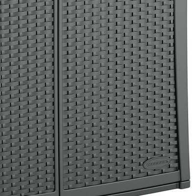 Neatly store your lawn and garden tools and accessories while adding a sophisticated style to your deck or patio with this 3-pack of Suncast Lockable Outdoor Cabinet Deck Storage Boxes, the ultimate solution for your outdoor storage needs.Offering a 97-gallon interior capacity, these cabinets are large enough to accommodate lawn and garden tools, grill accessories, and more. The included metal-reinforced, adjustable shelves further increase your organizational opportunities. Durable plastic construction is accented by sturdy, pad-lockable doors that provide superior strength and security (lock not included) and the wicker design looks great in any outdoor setting.These patio storage cabinets are weather, water, and rust-proof, ensuring long-lasting use, while their compact sizes make it easy to blend in with your existing outdoor decor. The storage bins are also easy to assemble and maintain. Simply wipe them down with a damp cloth to keep them looking clean and new.Increase your storage capacity while beautifying your space with this 2-pack of Lockable Outdoor Cabinet Deck Storage Boxes, and enjoy a clutter-free outdoor space.