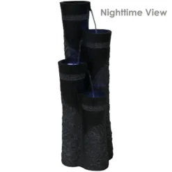 Add an attractive accent to the front door or patio with this elegant, outdoor water fountain. Each tier features a Greek-inspired pattern at the top for a touch of embellishment. This fountain also features bright, white LED lights in the lower three tiers, so this fountain can be enjoyed well into the evening. Each tier also features both smooth and rough textures in a gray or black color for added style. The water falls from the tallest pillar down to the shortest in small, eye-catching waterfalls. An included electric, submersible pump recirculates the water, allowing for a continuous flow of water throughout the fountain. Plus, this fountain does not require any plumbing for installation. Place this elegant fountain in the garden, yard, on the patio, or in other landscaping to accentuate the beauty and soothing relaxation of your backyard space.